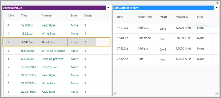 Multi-Domain View provides the complete view of SMBus Protocol activity in single GUI. User can easily setup the analyzer to generate SMBus traffic using a GUI or script. User can set different trigger conditions from the setup menu to capture Protocol activity at specific event and decode the transition between Master and Slave. The decoded results can be viewed in timing diagram and Protocol listing window with auto correlation. This comprehensive view of information makes it industry best, offering an easy to use solution to debug the SMBus protocol activity.